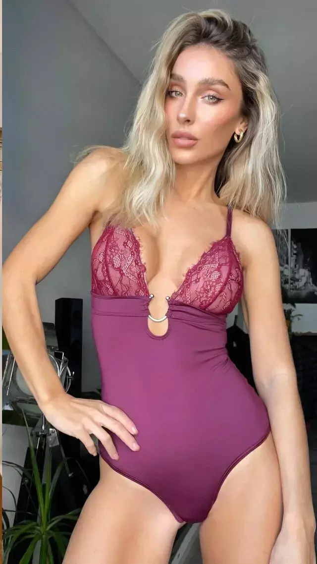 Body cola less de microfibra y puntilla, con aplique metálico en centro.